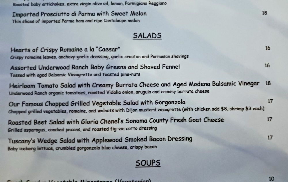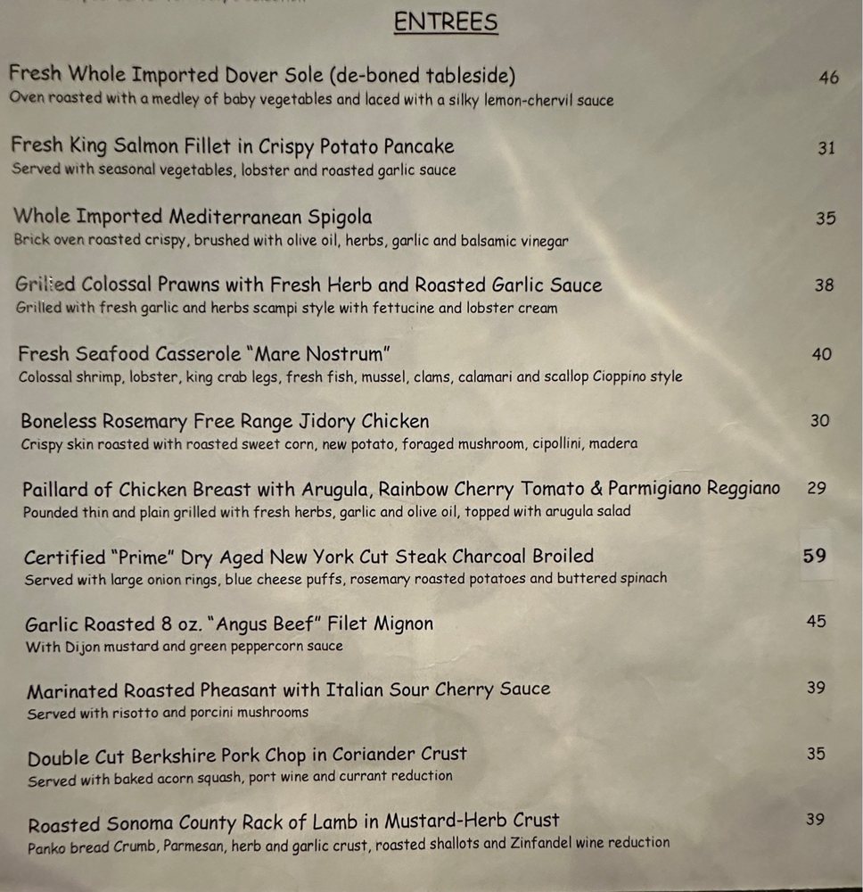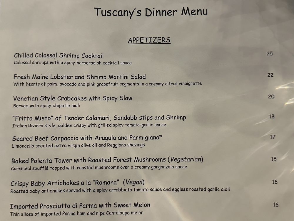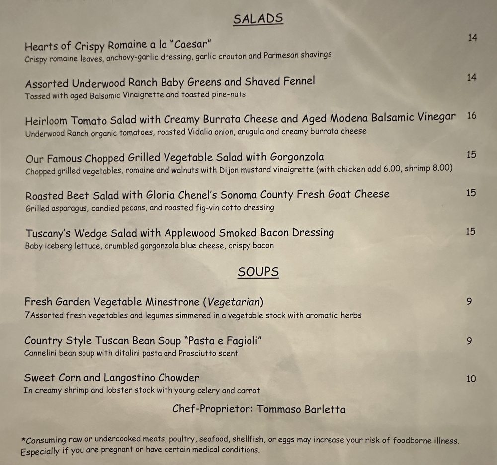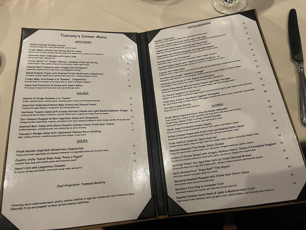 Introducing the menu at Tuscany il Ristorante, an Italian gem located in Westlake Village, CA. This classy establishment offers a variety of options for all preferences, including vegan and vegetarian choices. With a full bar, outdoor seating, and attentive waiter service, the experience is top-notch. The salads are fresh and vibrant, like the Assorted Underwood Ranch Baby Greens or the Hearts of Crispy Romaine a la "Caesar." Start your meal with appetizers like the Baked Polenta Tower or the Fresh Maine Lobster. For soups, try the Country Style Tuscan Bean Soup or the Sweet Corn and Langostino Chowder. Customers rave about the excellent service and the delicious dishes, such as the rigatoni with filet mignon meatballs and the Fresh Seafood Casserole "Cioppino Style." Tuscany il Ristorante promises an authentic Italian experience with every visit.